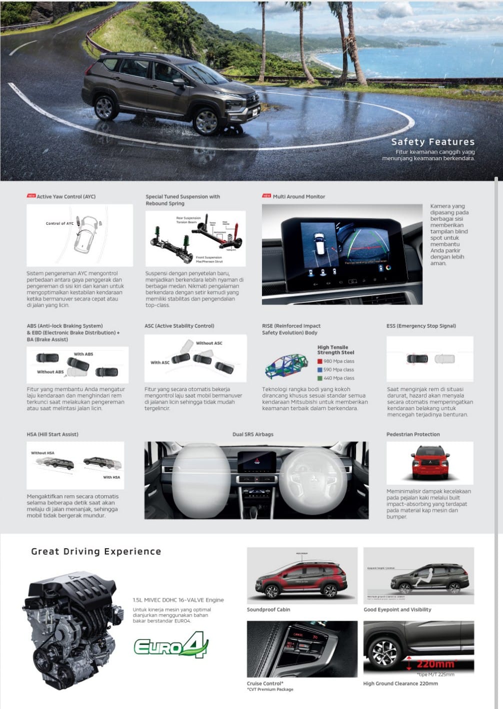 Dirancang dengan ground cleareance setinggi 225mm, Xpander Cross memberikan kenyamanan berkendara terbaik di kelasnya dan mampu melalui berbagai medan.
